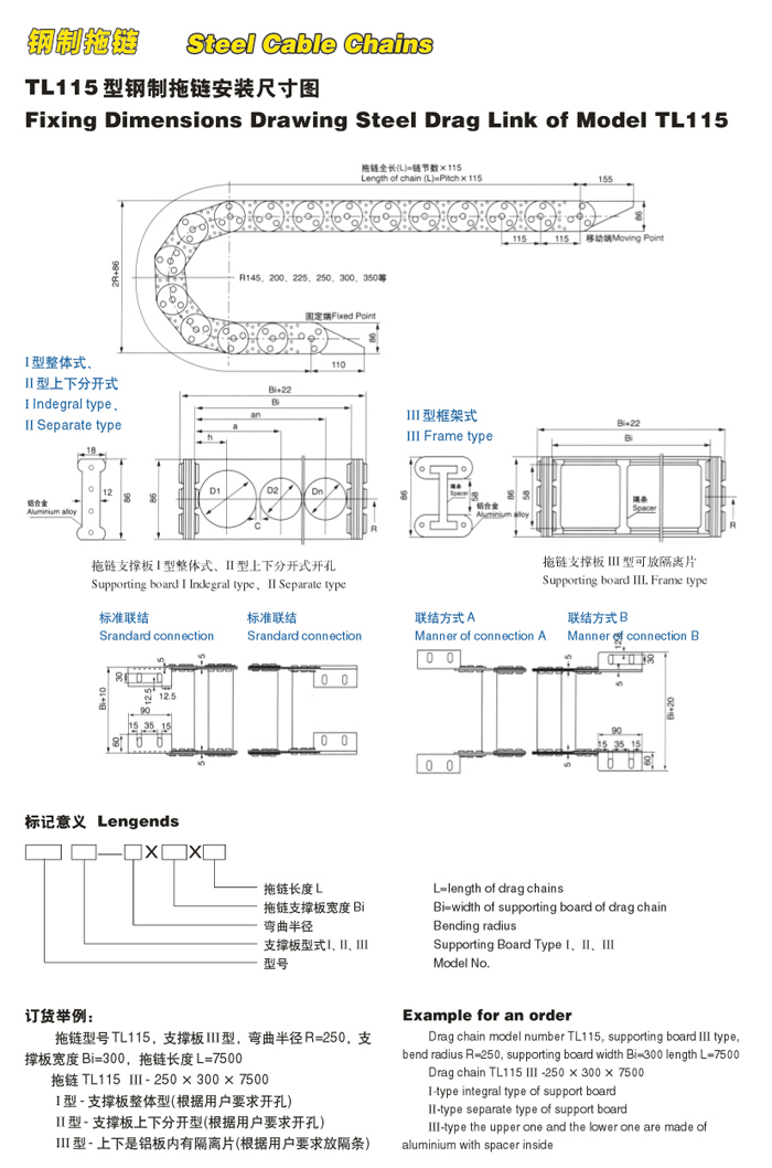 TL115III型鋼制拖鏈:簡介:節(jié)距115mm,彎曲半徑有145,200,225,250,300.鏈板高度86mm,拖鏈最小寬度80mm.內(nèi)高55mm。